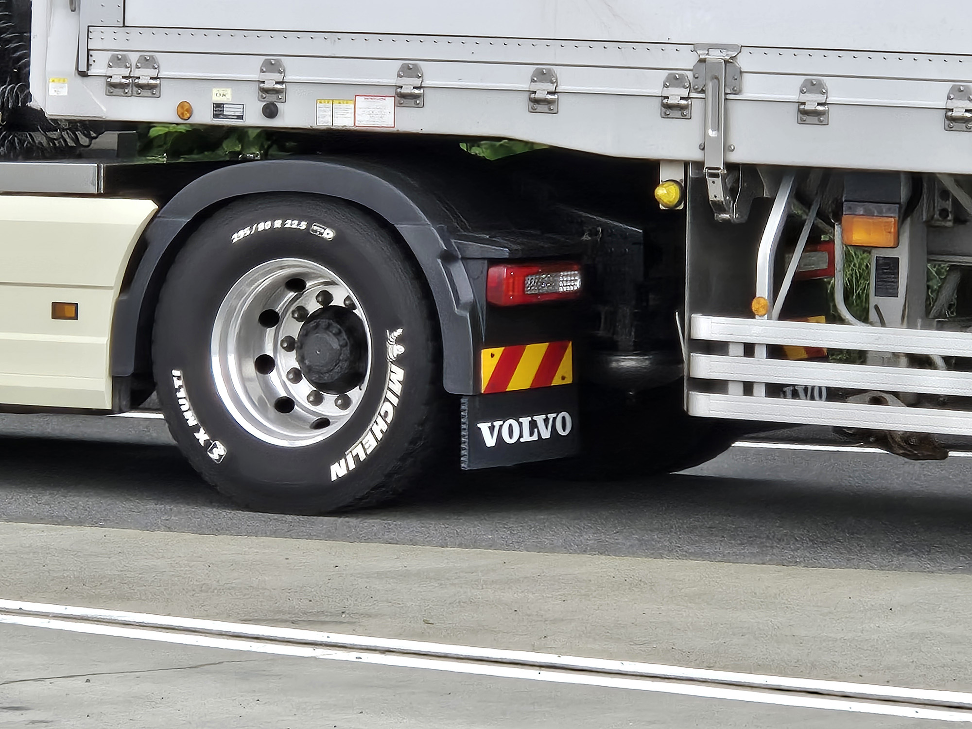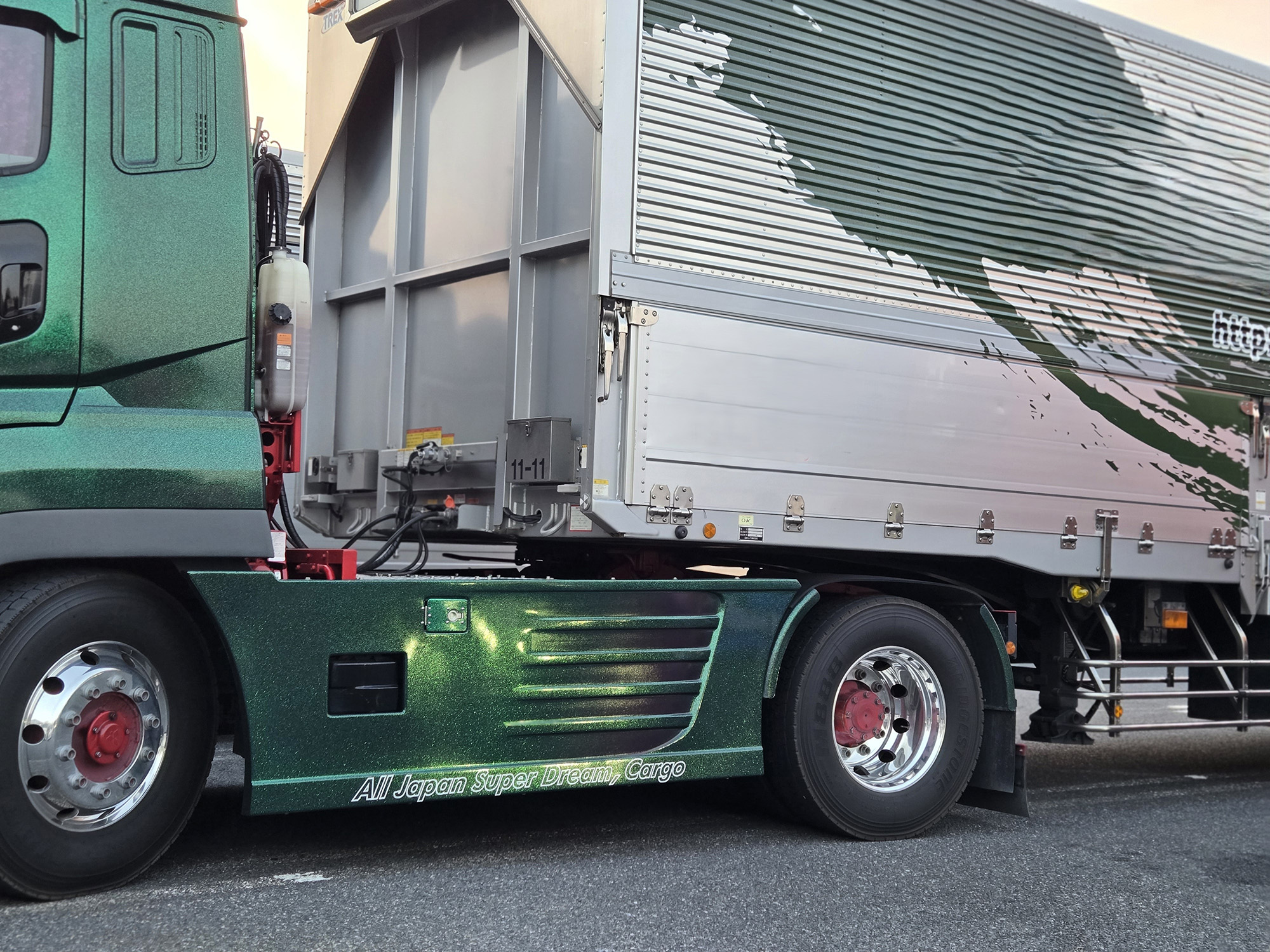 タイヤが大きいぶん、レーシーさも際立つホワイトレター。ただ文字を白くしただけなのに、とにかく目立つしカッコイイ! ほかのトラックも真似すればいいのに、と思うのだが、すぐに汚れてしまうことを考えると、なかなか手間がかかるカスタムなのかもしれない。