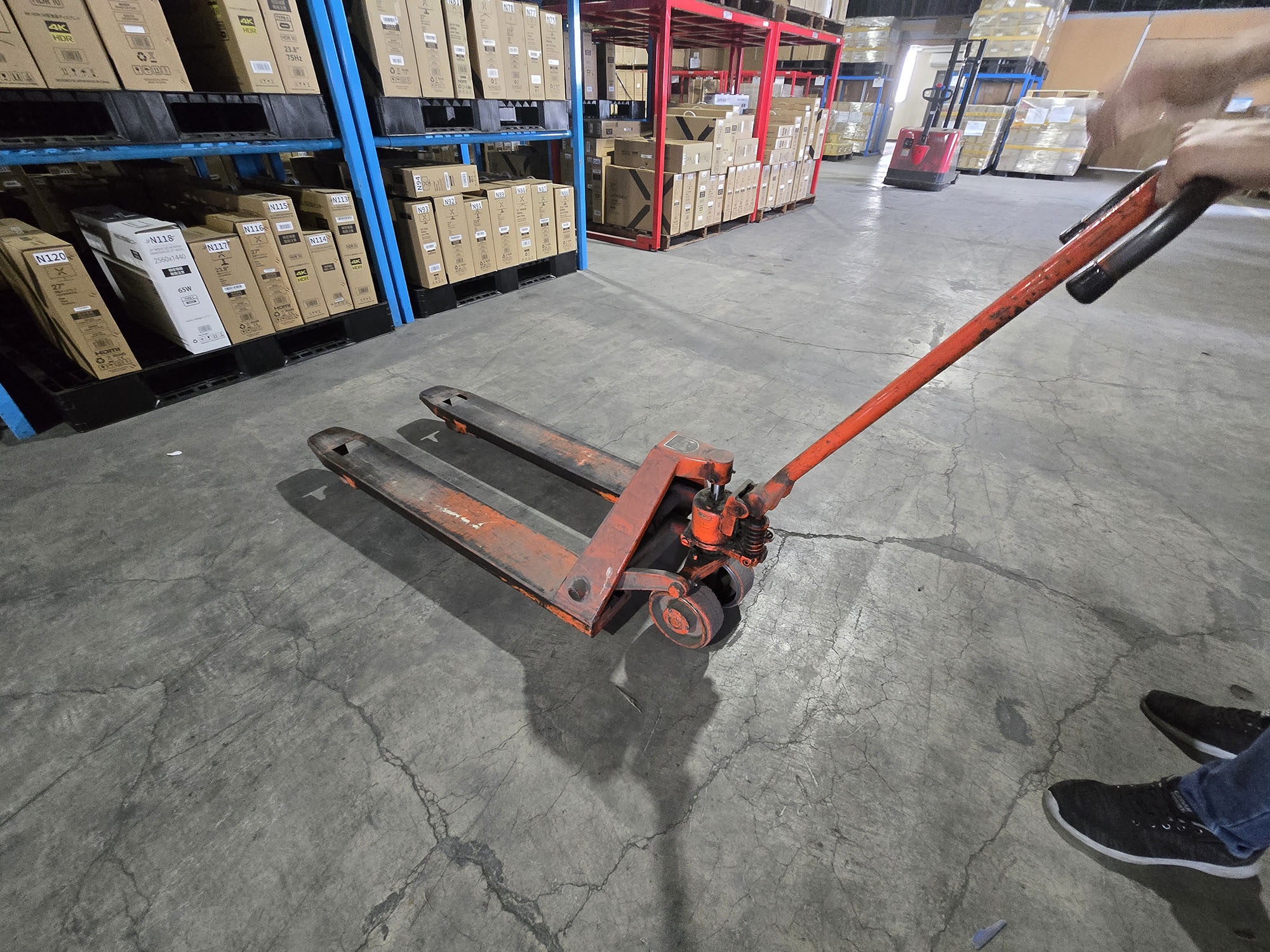 パレットを運搬するときにツメが滑り込みやすくするための傾斜なのだが、人力で本体を動かすハンドリフトの場合、この傾斜がないとツメを差し込むとき、非常に力が必要なのだ。これはハンドリフトの構造上の問題なのだが、ハンドリフトのツメ部分には移動用のローラーが付いている。そのためパレットにツメを差し込むときにパレットの穴部分に傾斜がないと、ローラーが引っかかってしまうためスムーズなツメの挿入ができないのだ。