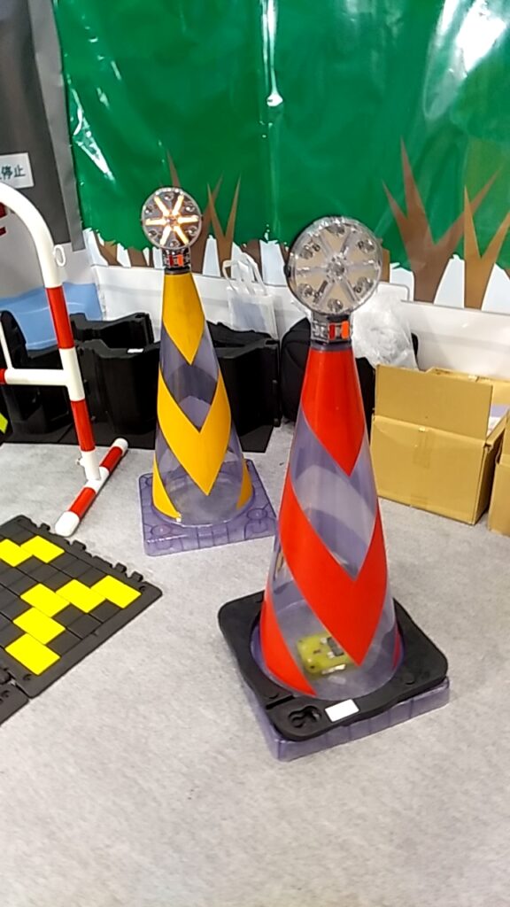 車線を規制するときには、標識車を盾にしてパイロンなどを配置する。規制の先端には回転灯・誘導棒を振る人形・矢板などを設置し、パイロンは路側あるいは中央分離帯から、規制する車線いっぱいまでテーパー状に置いていくのだ。夜間はパイロンを光らせるために、発電機からコードリールを伸ばしてひとつずつ電球を付ける。新しいタイプのものなら、パイロンに設置する充電式のLEDランプを使用しているので、発電機やコードリールを使わない。