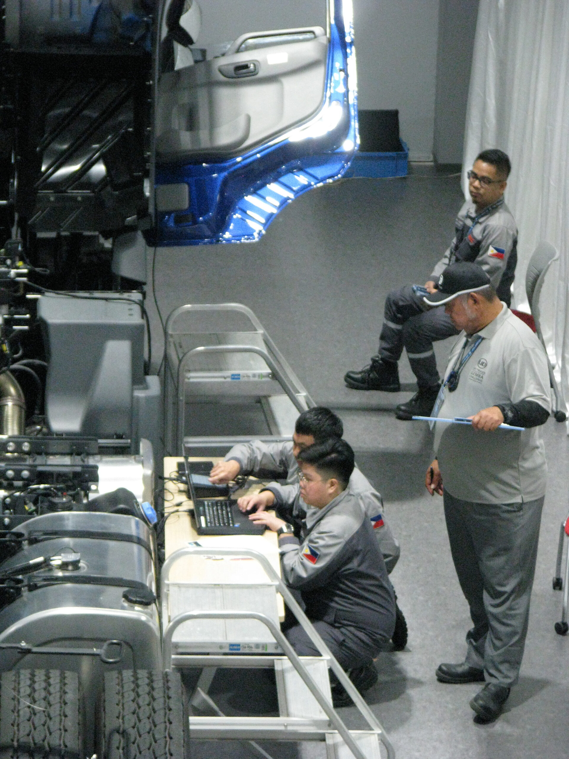 ふたつ目は、トラックの心臓部ともいえるエンジンだ。指示に従って部品を測定し、異常があればそれを特定して対処する。測定器や特殊工具を扱うスキルが求められる。3つ目では、テックツールと呼ばれる測定器使用する。フライホイールとカムシャフトのセンサーを測定し、信号値や信号波形から不具合を特定しなければならない。