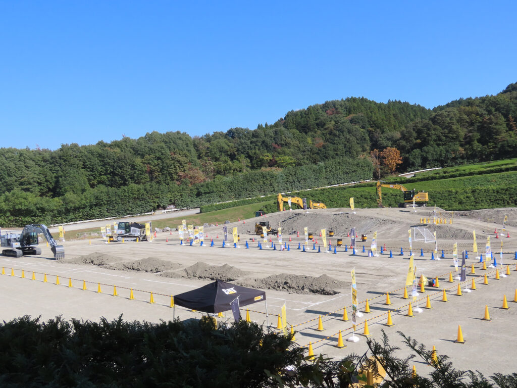 約30万㎡の広大な敷地に、屋外施設として土木現場に似せたデモエリア・デモ走路・トレーニングエリアがある。屋内施設としてはホール・研修室・整備工場のほか、屋外エリアを安全に見学できる観覧席が設けられている。この屋外エリアを利用して、油圧ショベル・ブルドーザー・ホイールローダーを使用した、3つの競技が行なわれたわけだ。