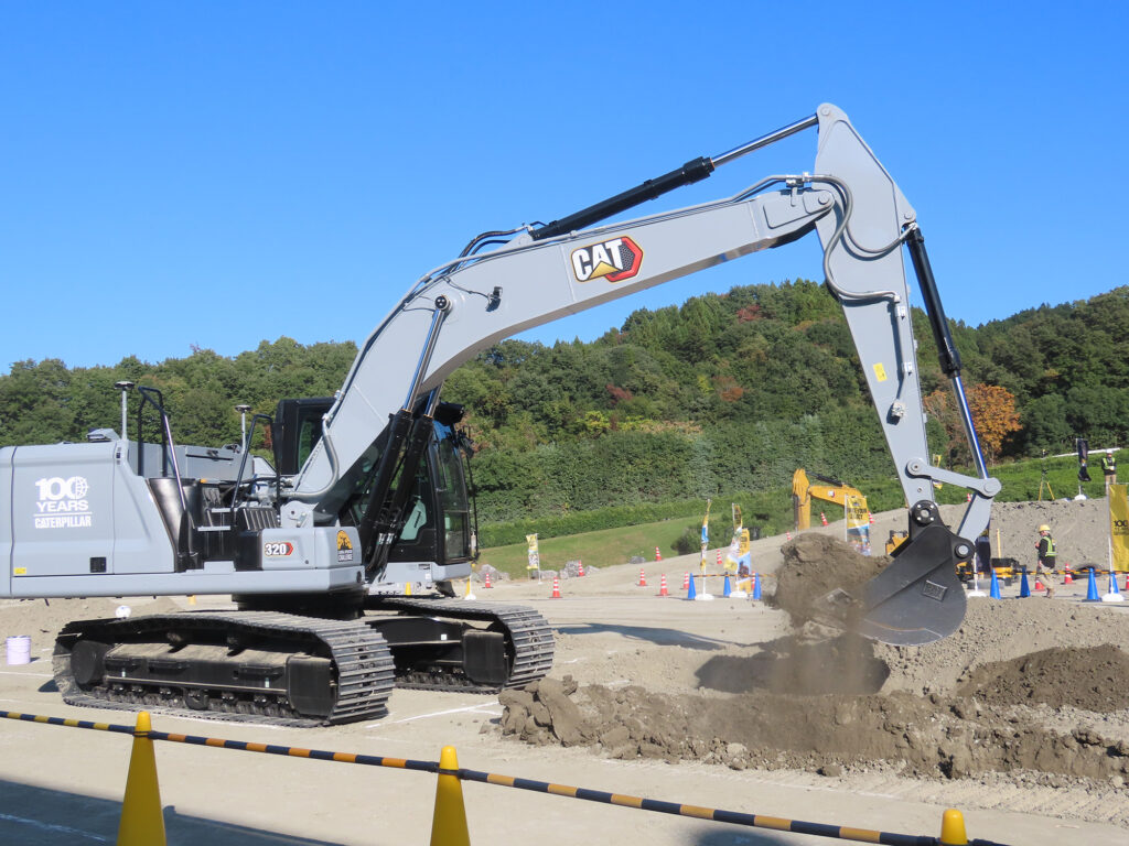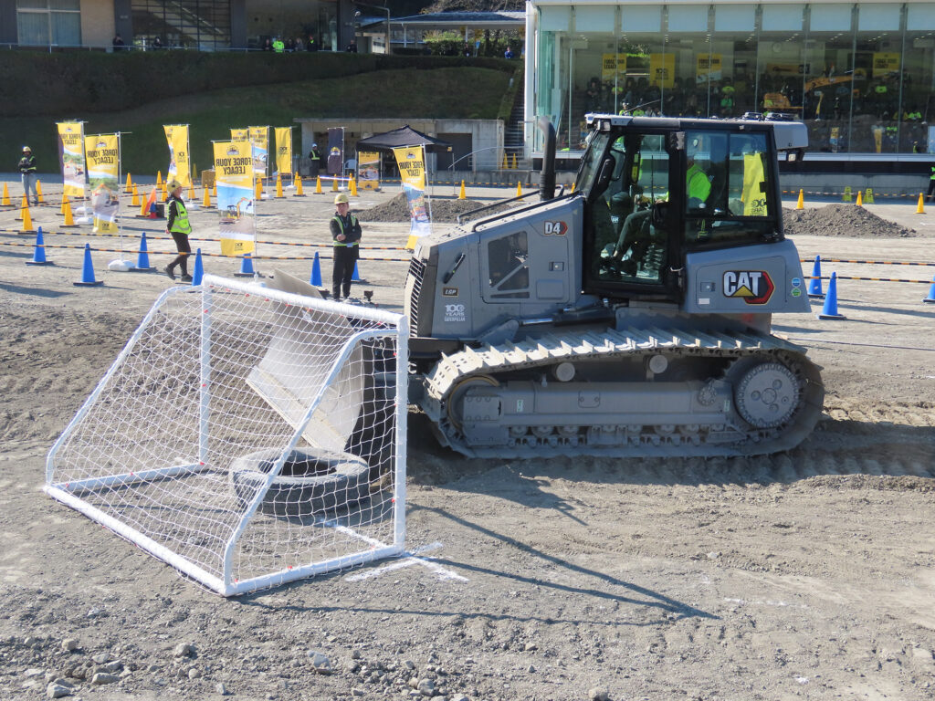 油圧ショベルの競技ではCat320が使用され、正確な溝掘削を競った。掘る穴の目標は、深さが600㎜で長さは4500㎜。溝の傾斜は、25%だ。ブルドーザー競技はCat D4を使用。指定されたコースを用意された障害物に触れないように走行し、最後はブレードで押土均しを行う。小型ホイールローダー競技は、Cat938を使う。正確な量の砂利をすくい、スラローム走行を行うといったものだ。