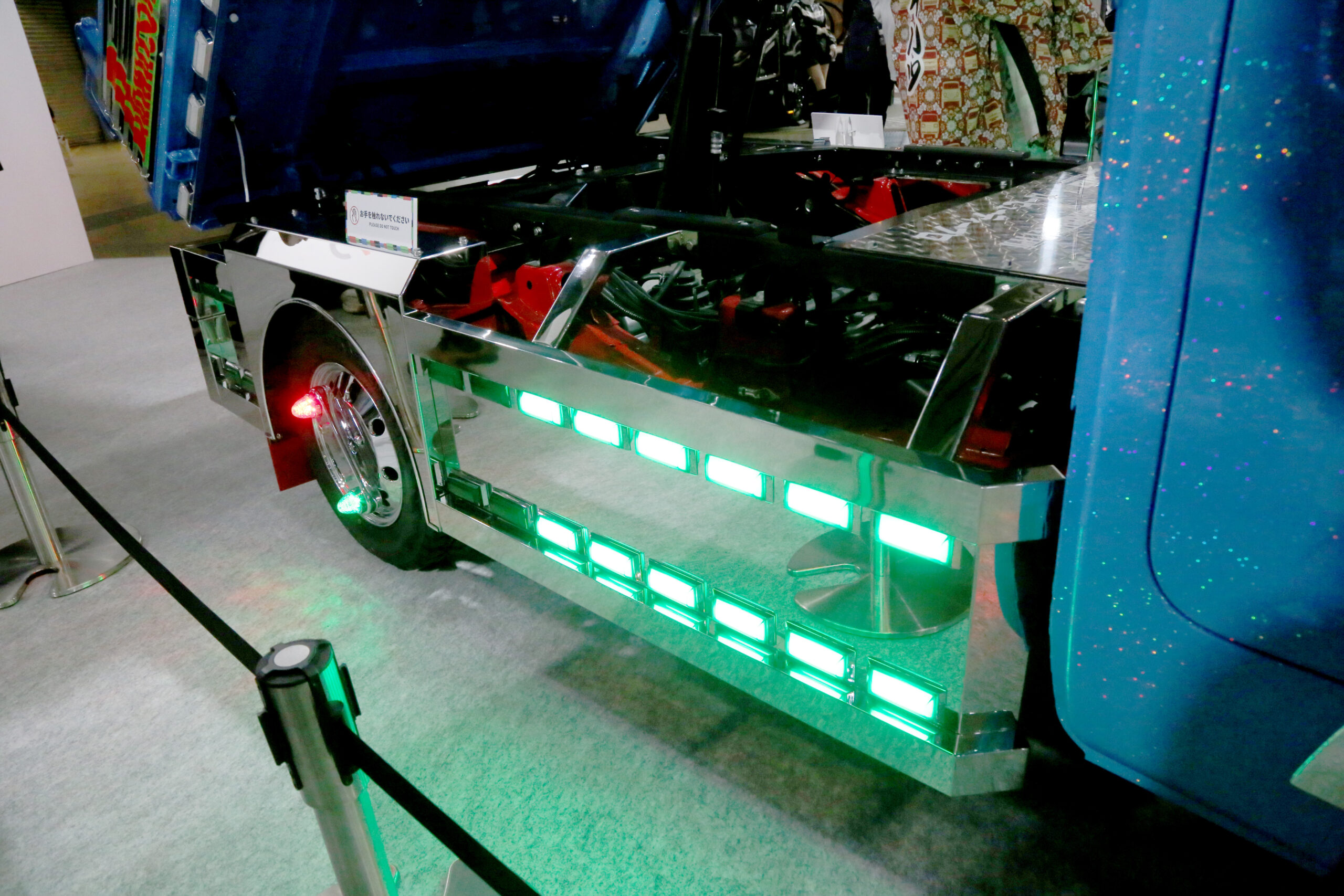 サイドには前後のアルミホイールにホイールマーカーを装着。さらにサイドバンパーも本格的なデコトラならではのステンレス製のものが架装されている。ダンプボディ(荷台)のアオリには波板も施工し、リアバンパーもステンレスで製作し、丸型のレールランプを配している。