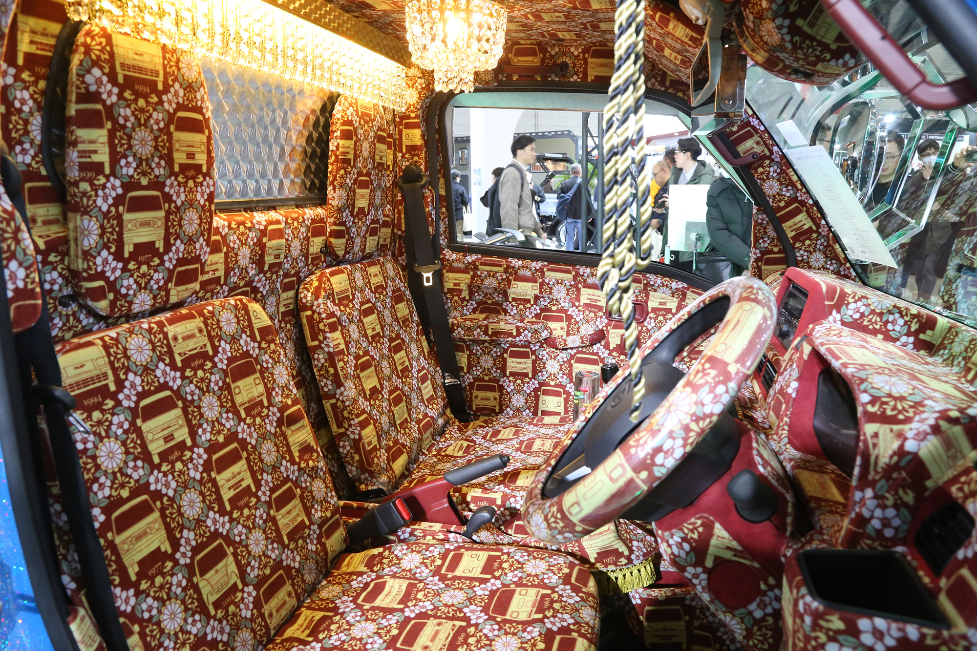 インテリアもデコトラの仕様にアートアップ。天井やリア側にはシャンデリアを装着し、シートカバーやドアトリムなど内装の生地は歴代ハイゼットの顔を並べた金華山風の布地を製作。この生地はハイゼットの内装だけでなく、オートサロン当日の会場スタッフが着るハッピにも使用されている。