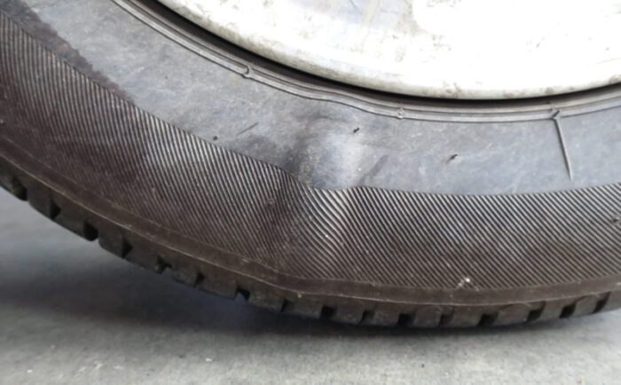 ではさっそくピンチカットについて説明していこう。タイヤ側面を観察した時に、「こぶ」のようなふくらみを発見したら、それがピンチカットである可能性が高い。タイヤの一部が不自然に盛り上がってこぶのような状態になるので、ひと目でわかる。
