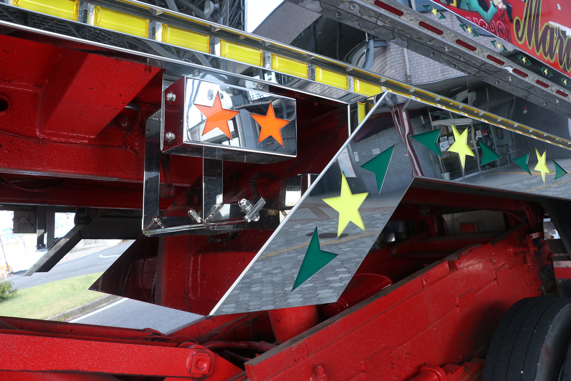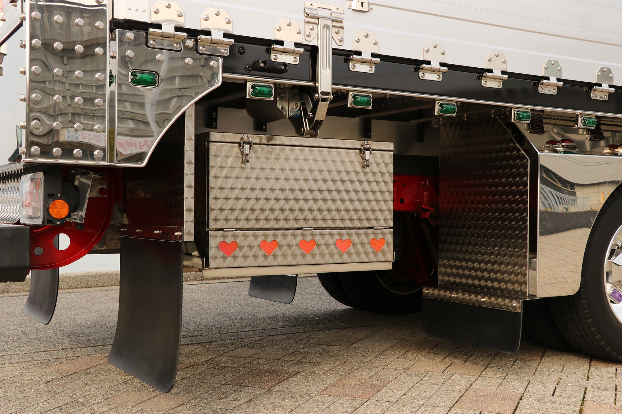 同様の理由で「ハート型」も根強い人気がある。ただ、クールなイメージを持つ他の図形と違い、かわいらしいといったイメージが強いので、ワンポイント的な使い方をされることが多いようだ。厳ついなかにも、ちょっとおちゃめな感じを演出する図形である。このほかには、純和風な「扇型」なども好むドライバーが多い図形だ。このように、デコトラは様々な図形で飾られており、それが独特の雰囲気を醸し出している。まさに、ドライバーのセンスが浮き彫りになるアイテムだといえよう。