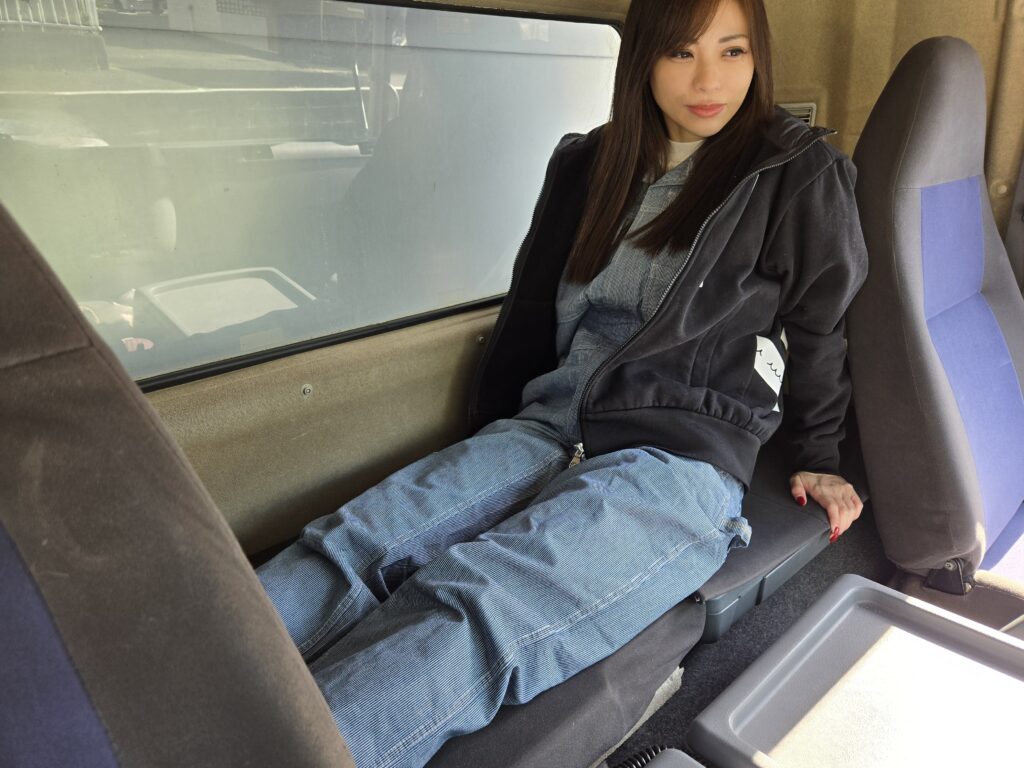 運転席の後ろにガチの寝室スペースがあるのを見て、「ここで住めるじゃん!」と感動し、そしてとりあえず座ったり横になったりしてみる。これは初めてトラックにのった女の子の鉄板。