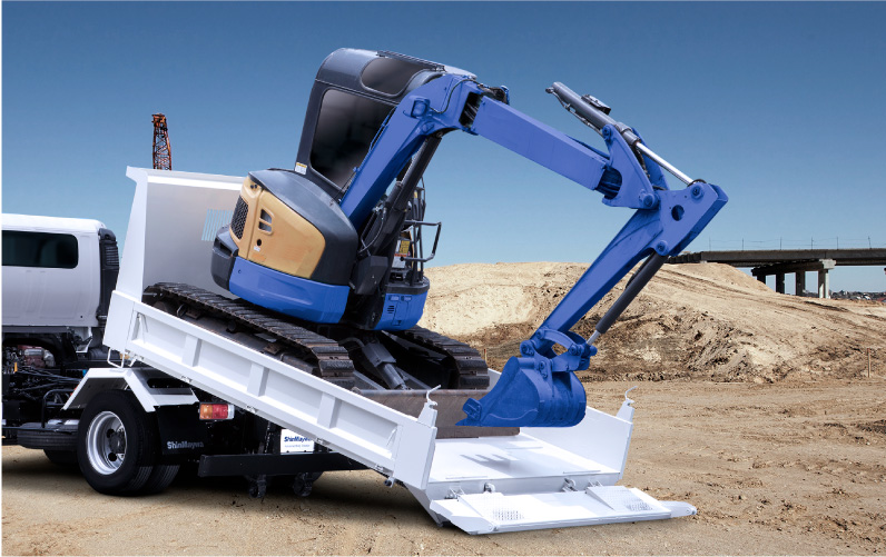 走っている分には普通のダンプトラックだが、荷物を積み降ろしする際に荷台が後方にスライドして後部を接地させ、傾斜状態を作り出すことができる。小型重機などを、自走させて積み降ろしすることが可能なのだ。通常のダンプトラックとしても使用できるため、1台で2役をこなすことができる効率性を持つ。