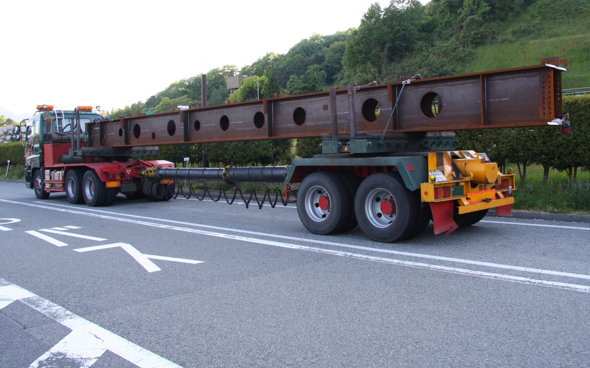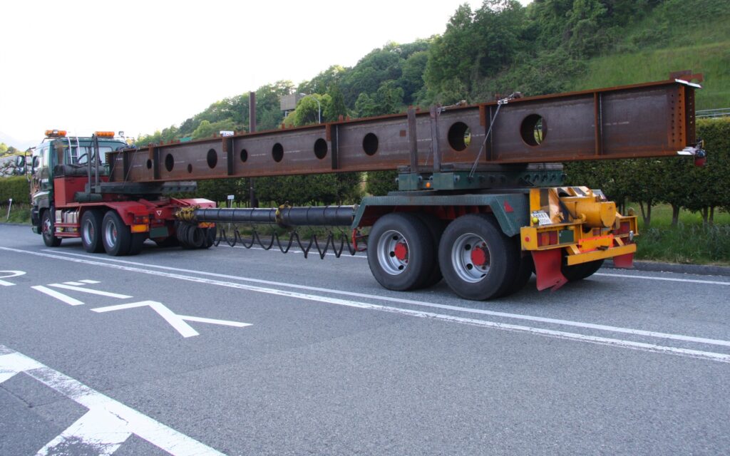 鉄道車両や橋梁部品などといった、40mを超えるような長い荷物でも運搬可能なトレーラー。荷台が伸縮する構造になっているため、荷物に合わせて長さを調整することが可能。また、使用しないときは縮めればコンパクトに駐車しておくことができる。